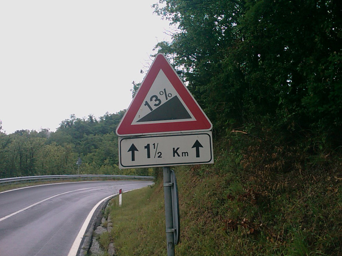Dernæst de lokale, som fik ret i, at det ville komme til at gå op ad. Fra det punkt hvor byskiltet viste ud af Pianoro, gik det op ad. Det første 7 km. meget intenst, med flere 13 %-stigninger. Det var så stejlt, at fru Garmin satte auto-stop på uret. Det svarer til at holde stille.