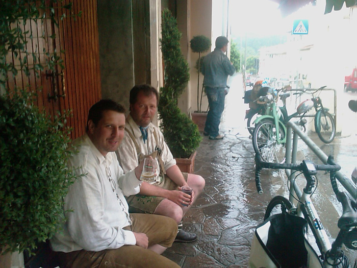Da jeg havde kørt i en time og 30 minutter, havde jeg kørt 18 km., herefter jævn pæn stigning til Passo della Rasticosa i 968 meters højde. En kort nedkørsel på en km. og ned i 800 meters højde, inden det igen gik op ad mod Passo della Futa i 903 meters højde. En strækning på 54 km. op ad. Det har jeg aldrig prøvet før. Op - op - op og op. Og så i silende regnvejr. Han havde en kande i begge hænder i dag. Søgte kort efter Passo della Futa ind for at spise. Det var opløftende, for jeg fik at vide, at der ventede mig en lang nedkørsel, og kun en stigning mere, nemlig ca. 10 km. før Firenze. Ud i regnvejret igen. Efter 5 km. stoppede regnen, og jeg kom hurtigt til et område hvor det slet ikke havde regnet. Der sad en dame i korte ærmer og ordnede have. Meget store forskelle i bjergene. Dejlig lang nedkørsel, uden ret megen regn. Kom til opkørslen til Bivigliano, og regner startede igen. Kørte dog ret nemt de 476 meter op, og fandt mine to NSU-venner siddende på toppen med en lille fadøl. Sjovt at hilse på disse to NSU-svende igen. De havde kørt 60 km. i dag på knallert. Det sætter lidt præstationen i dag i relief. Jeg har en dejlig fornemmelse med det jeg har præsteret i dag. Jeg var betænkelig fra morgen af, ville gerne ende i Firenze, men vidste også at det var et ambitiøst mål. Det lykkes, og det er jeg meget glad for. Der er simpelthen ikke flere bjerge som kan komme i vejen for, at jeg når Rom. Med kongeetapen i dag ligger vejen til Rom åben, og det har været en forløsning. Med gennemførelse af den lange opkørsel i dag føler jeg, at jeg har kørt en strækning som ikke alle kan gøre mig efter. Jeg er stolt. |